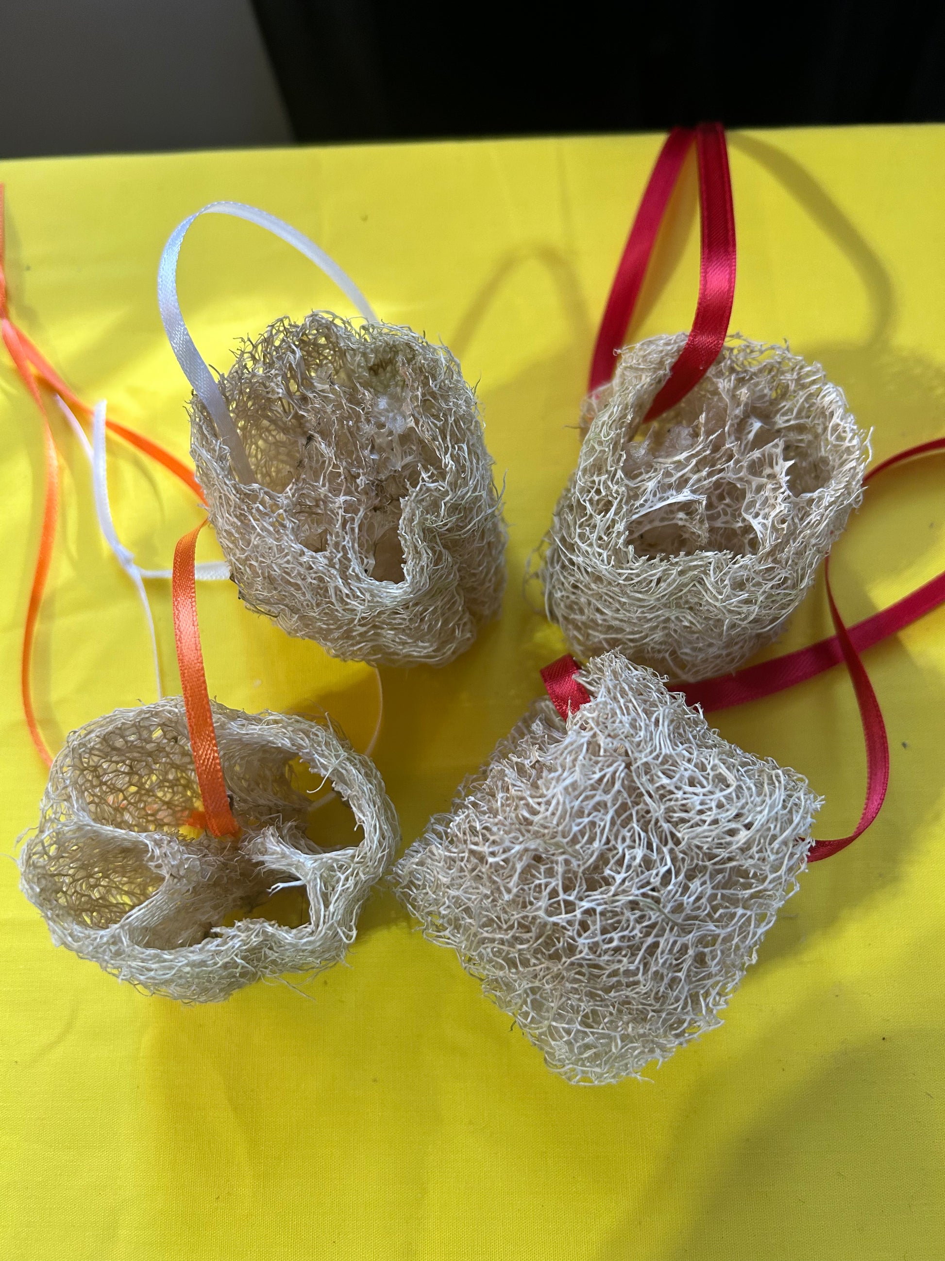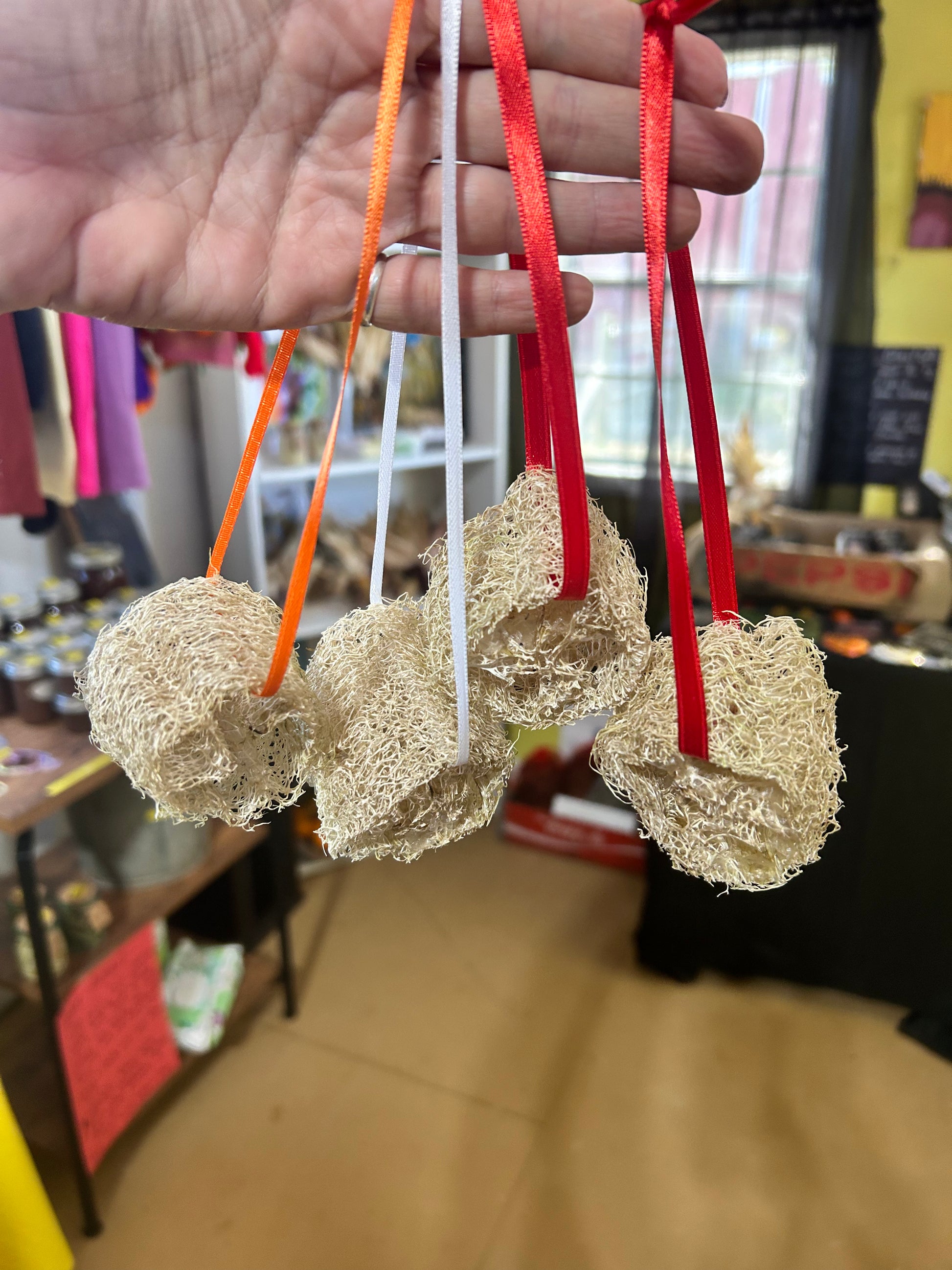 Home grown in our garden luffa! We have several lengths available. We removed most of the seeds but some may still be stuck inside the longer ones.